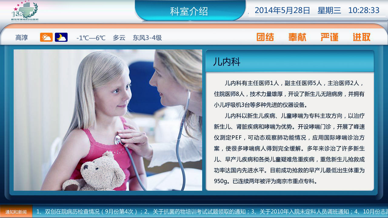 大廳是醫(yī)院的窗口,可以播放一些特色門診和科室介紹、專家介紹,提高知名度,方便患者就醫(yī)。介紹權威醫(yī)生、專家,方便患者按需求有針對性的進行診斷,縮短就診時間,還可根據(jù)一些新藥物、療法和新型醫(yī)療儀器器械的生產(chǎn)廠家的要求播放其的宣傳片,方便患者了解醫(yī)療動態(tài),方便患者就診,還可以提高醫(yī)院經(jīng)濟效益。還可緊急、實時信息或通知插播,掛號和急診信息發(fā)布,提高辦事效率。