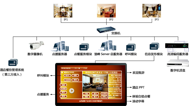 數(shù)字媒體信息發(fā)布系統(tǒng)具體實施目標(biāo):在活動廳室、出入口、會議室、電梯廳、宴會廳等相關(guān)部位安裝多媒體音視頻系統(tǒng)線路接口,與控制室實現(xiàn)互通互聯(lián)。根據(jù)活動任務(wù)的需要在不同地點安裝各種類別的液晶顯示終端,可以顯示文字、圖片和視頻信息,各顯示端音視頻設(shè)備既可以統(tǒng)一發(fā)布信息,也可以按個性發(fā)布信息,還可以按編組發(fā)布信息。針對客人重大的活動,例如:婚宴、壽宴、大型聚會等提供全方位的高清音視頻直播服務(wù)等。
